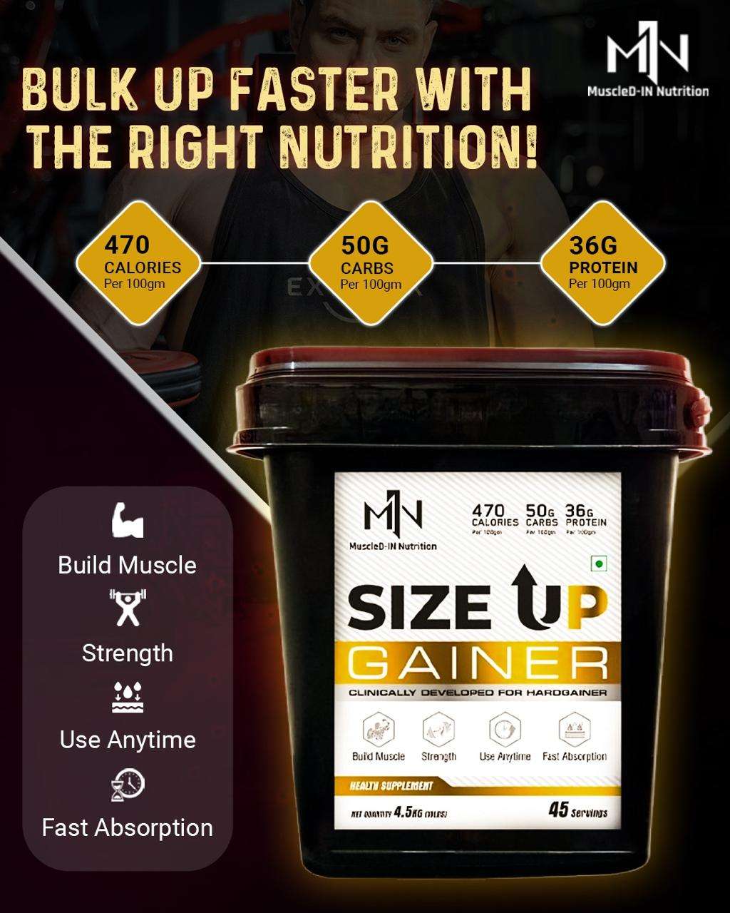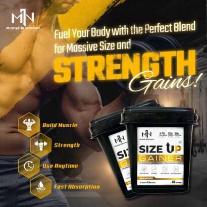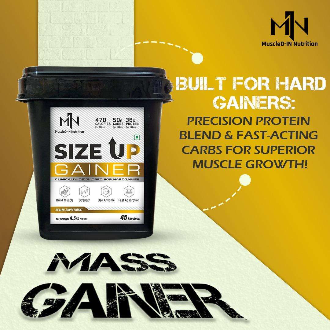MuscleD-IN Nutrition Size Up Gainer 4.5kg is a premium calorie-dense gainer with protein and carbs, designed specifically for individuals who struggle to gain weight and muscle mass. This advanced formula delivers 470 calories, 50g of complex carbohydrates, and 36g of high-quality protein per 100g, making it one of the best mass gainers for hardgainers available in India.